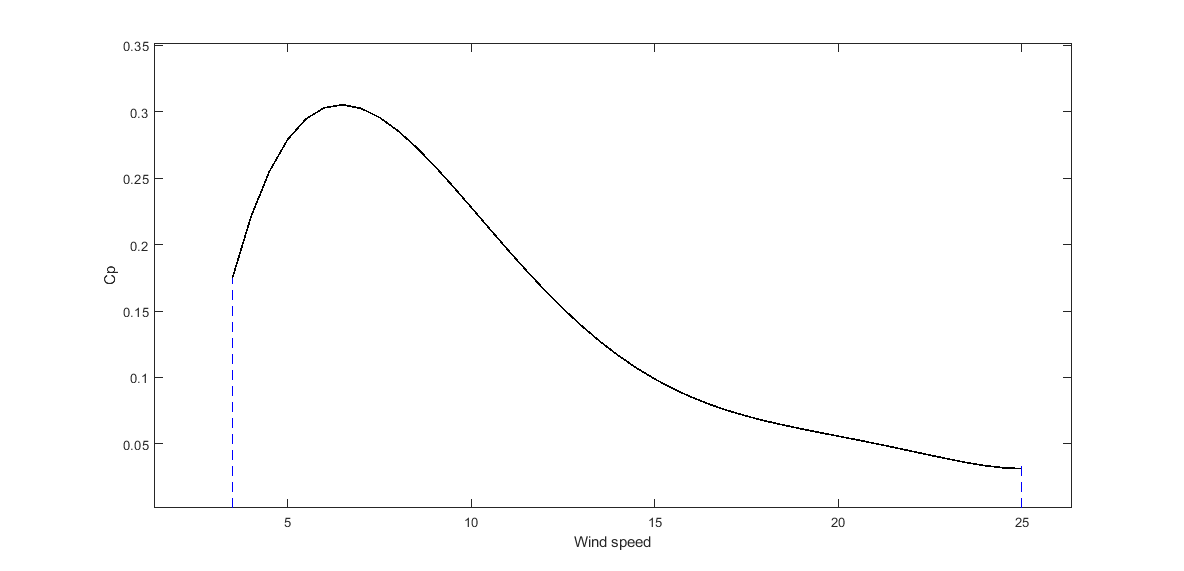 The power coefficient Cp is a dimensionless parameter that expresses the effectiveness of the wind turbine in the transformation of kinetic energy of the wind into mechanical energy. This coefficient is a function of wind speed, speed of the rotor blades, and the pitch angle. For our Wind Turbine with DFIG model, rotor blade length is set to R = 50 m, while air density is set to . The pitch angle is automatically regulated in such a way that the change of Cp is as presented in Figure 1: