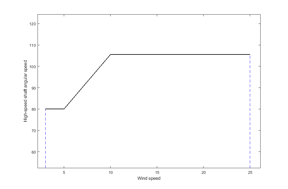 Based on the wind speed and the power coefficient, we can calculate the mechanical torque on the high-speed shaft. The rotor-side converter control is set up in a way that it adjusts the rotor speed based on the current mechanical torque. That dependency can be observed in Figure 3.
