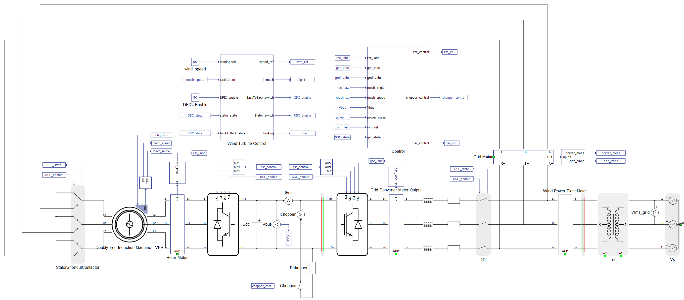 The DFIG with the back-to-back converter model is presented in Figure 4. The Stator Contactor can be seen on the stator side (bottom left) while the Converter Contactor is visible on the back-to-back converter side (bottom right). Their purpose is to disconnect the DFIG and back-to-back converter from the grid and bring the rotor speed to zero when the wind speed is out of operating range or when when the braking is activated. Contactors are controlled in the Contactor control subsystem.