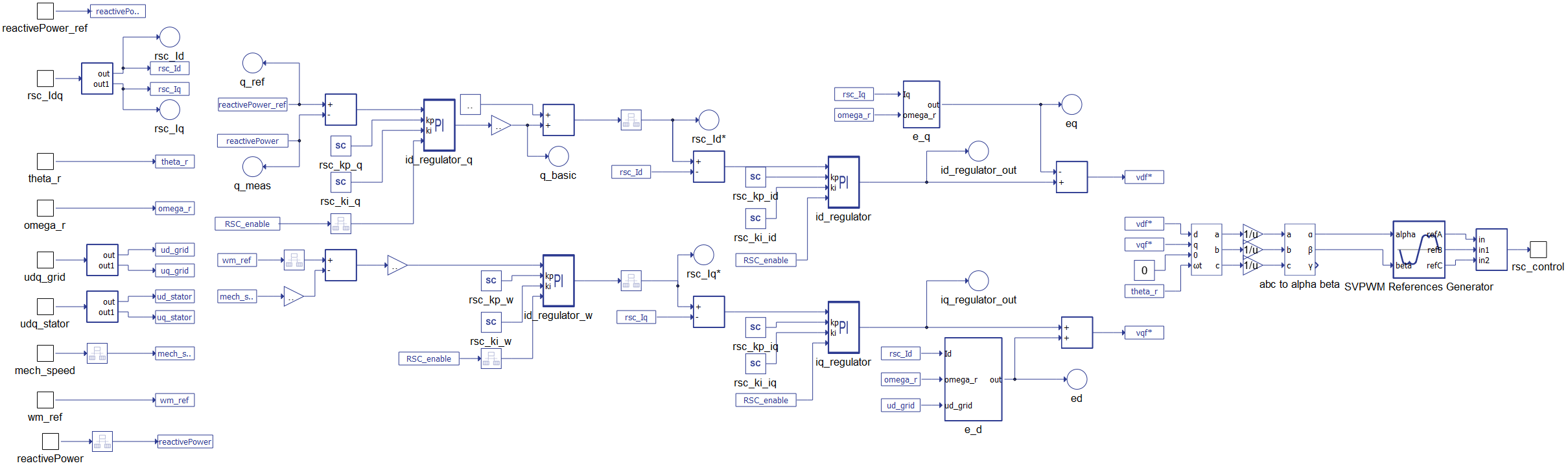 In Figure 5, we see the Rotor-side Converter Control subsystem where the vector control is implemented. This control is in charge of supplying the rotor with voltages that take a different amplitude and frequency at steady state in order to reach the required speed of the rotor. Input ‘omega_r’ feeds this control as an output of a C function based on the wind speed input.