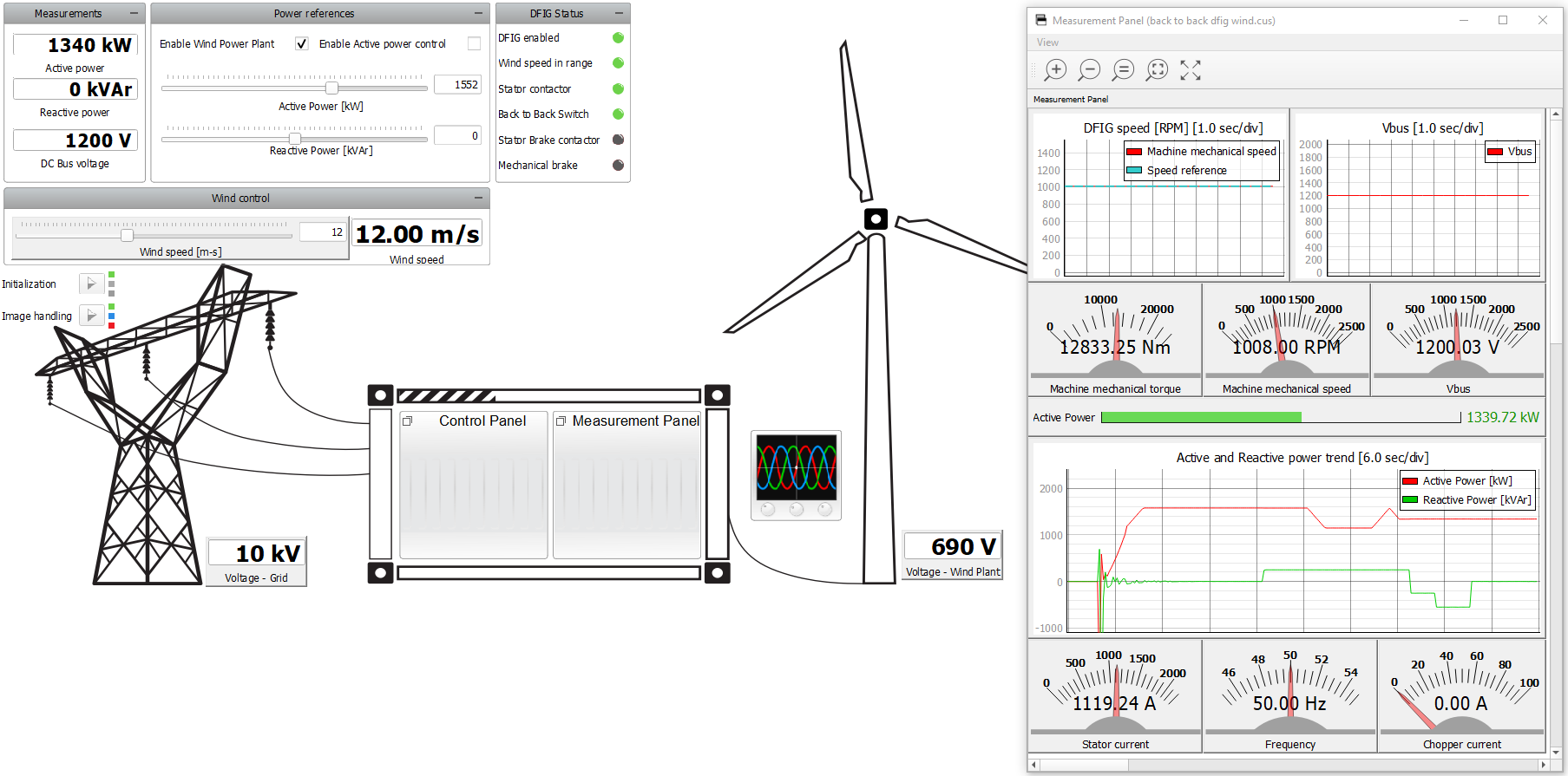 The first simulation example observes the impact of a change in wind speed from to on the state of the model. You can change the Wind Speed in the SCADA panel, and the corresponding change in speed of the rotor shaft, power output, and disturbance in Vbus can be seen in the Trace graphs in HIL SCADA (Figure 6). There is also a possibility to enable and disable the Wind Generator at any moment by unchecking the Enable machine checkbox. The state of the contactors (stator and back-to-back contactor) can also be observed in the SCADA panel. PI parameters of the regulators can be changed through SCADA, by changing the value in the Text box widgets.