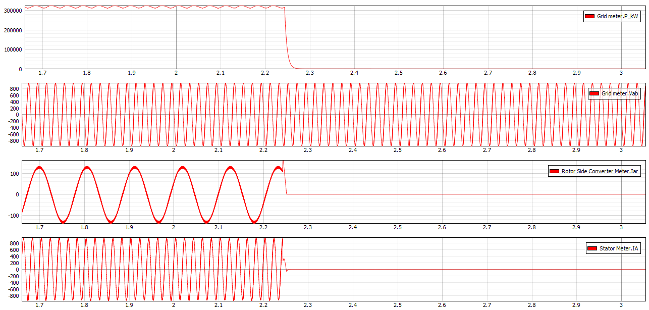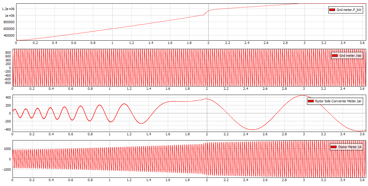 In Figure 7, we can observe changes in power output, rotor and stator currents, and the invariable line voltage, measured by the three-phase meter component.