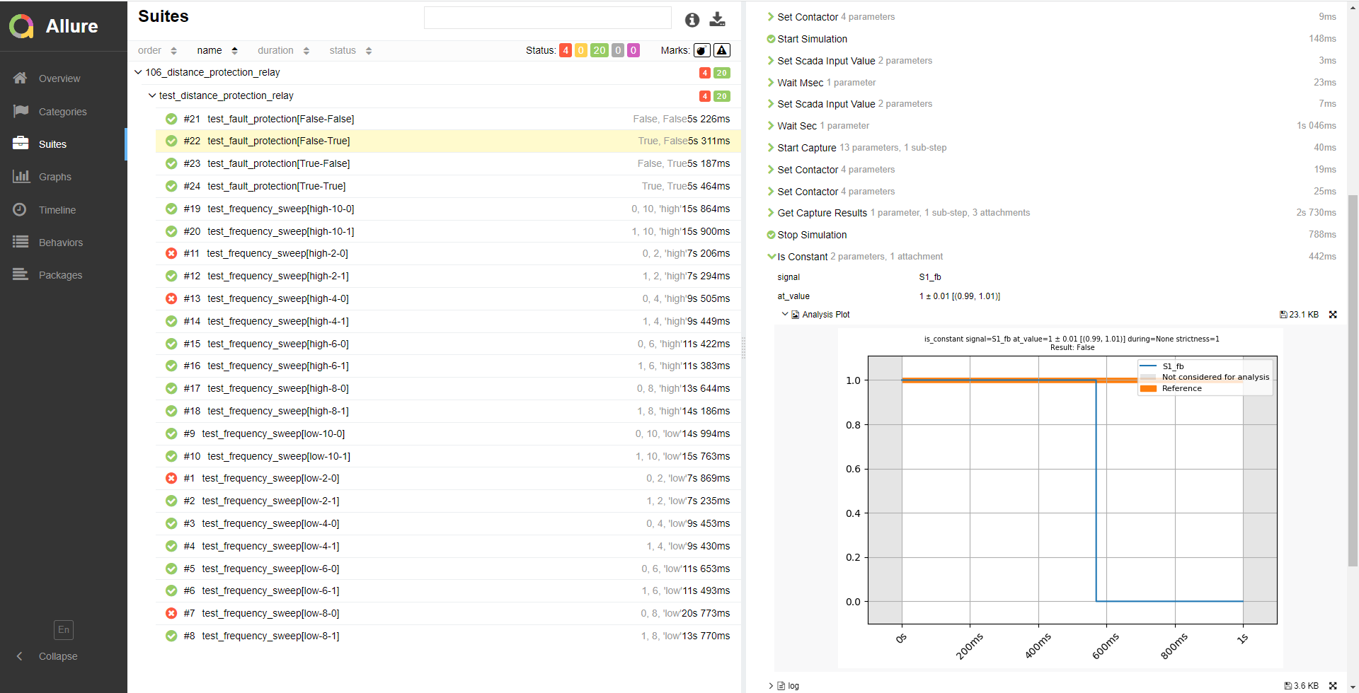 The provided test automation script validates the distance relay tripping for different types of faults. It demonstrates the CODO algorithm for filtering faults tripping caused by a frequency sweep. This series of tests are expected to result in some faults, as shown in the Suites section of Figure 8. Additionally, the distance protection relay's reaction to grid faults is checked as well, with fault_1 expected to trip the relay while fault_2 is not. The former case is shown by the graph on the right of Figure 8.