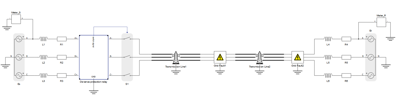 Simulation of a distance protection relay connecting two grids with fault injection.