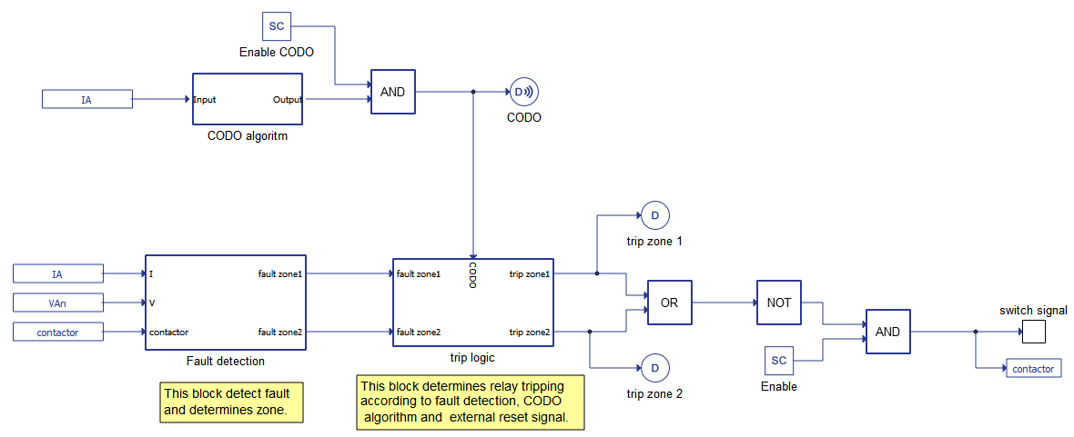 The protection logic implemented in the Distance protection relay block includes an Closing Opening Difference Operator (CODO) algorithm and a Fault Detection for measurement, which provides inputs to the trip logic. This is shown in detail in Figure 3.