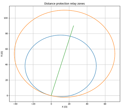 A distance relay is a type of protection relay most often used for transmission line protection. Distance relays measure the impedance from the installation side to the fault location and operates in response to changes in the ratio of measured current and voltage. The characteristic of the relay is represented in the complex Z plane, while the characteristic of the transmission line is represented as a straight line passing through the origin of the R-X plane, as shown in Figure 1.