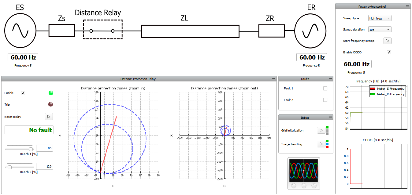 The one line diagram displays the state of model values – frequency in the grid, contactor status, and also the presence and location of the transmission line fault.
