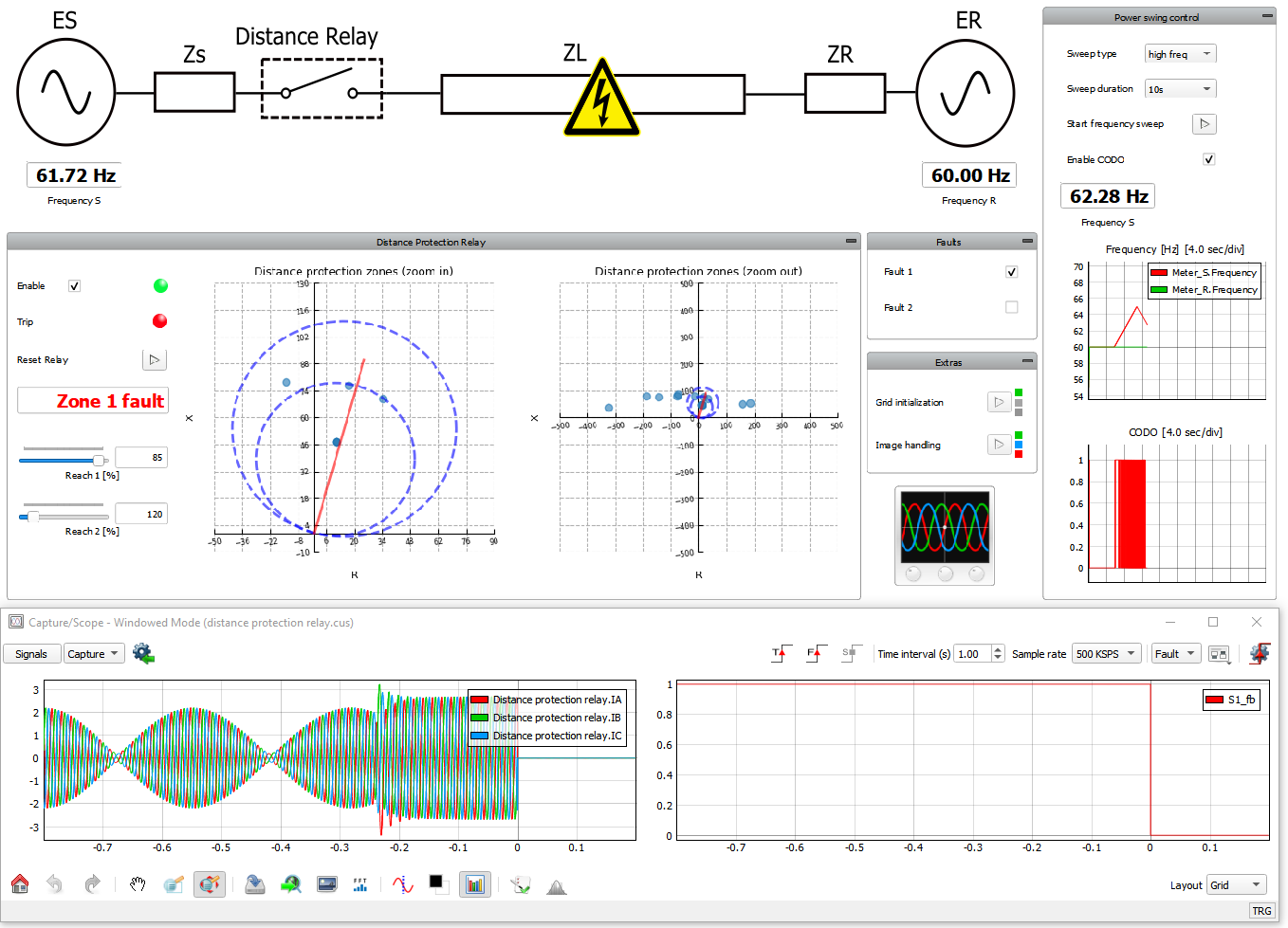 The purpose of this model is to show the response of the relay to a change in the impedance value. The impedance value depends on the frequency in the grid and on the presence of a fault in the transmission line. By changing this impedance, the CODO signal changes, and we can observe it trace graph.
