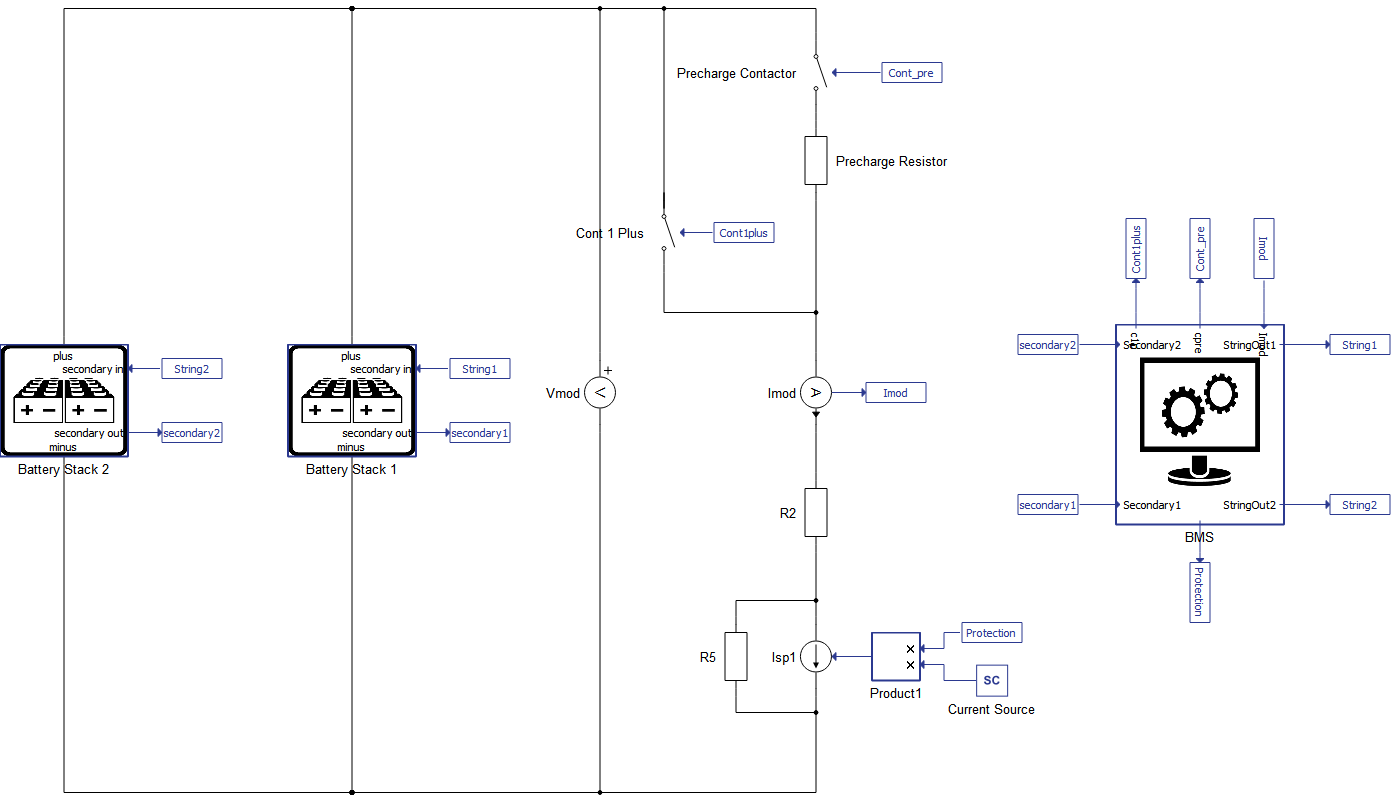 In addition to the Battery Stacks, the BMS communicates with the precharge circuit and the positive contactors in the model. The precharge contactor is in series with a 100 Ω resistor, to reduce the total current to the battery cells when first charging them. To simulate a discharge or a charging current for the Battery System, a Current Source is used. Additional resistors are included in the model for numerical stability.
