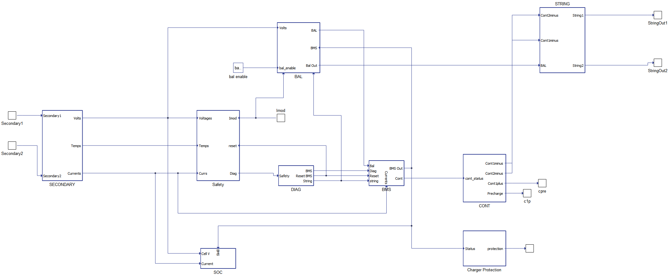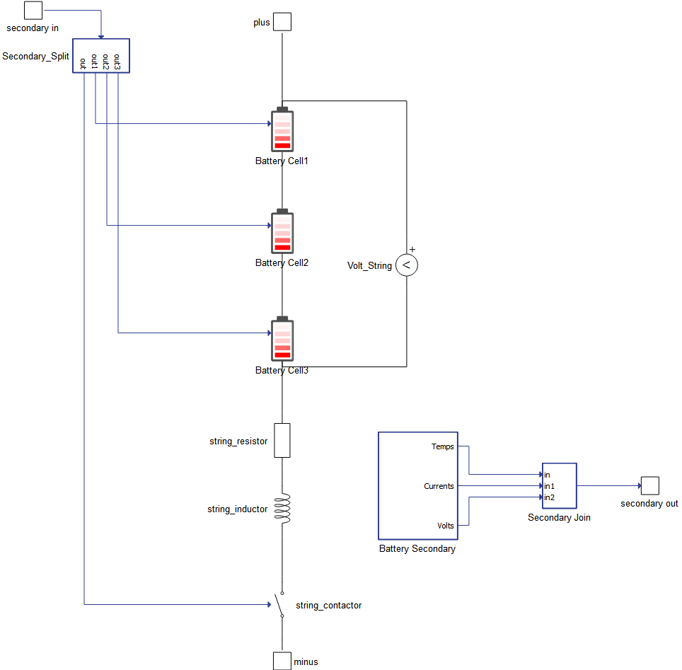 Out=[[T1, …, Tn],[i1, …, in],[v1, …,vn]]where n is the number of cells, and Tj, ij, and vj are the temperatures, currents, and voltages of the jth cell, respectively. The vector "secondary in" contains the contactor, the balancing, and the temperature inputs for each battery cell.