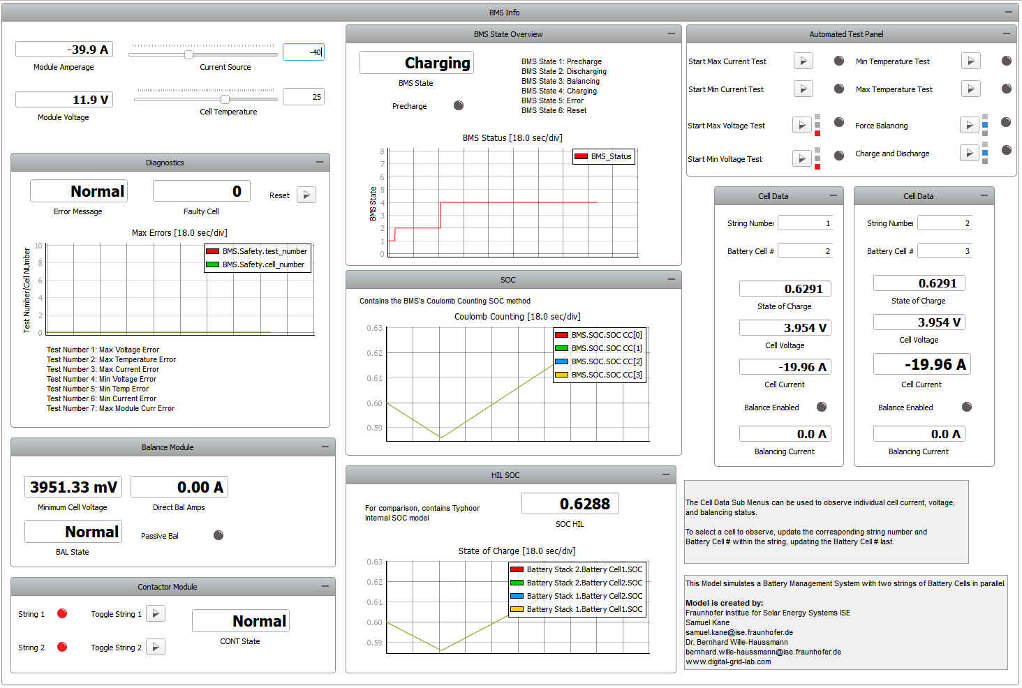 The default model with two strings and 3 battery cells per string has been tested and proved functional on the HIL402 and VHIL+, but should work with all HIL systems. As mentioned before, the test panel triggers various error conditions in the BMS safety purview. They are as follows: