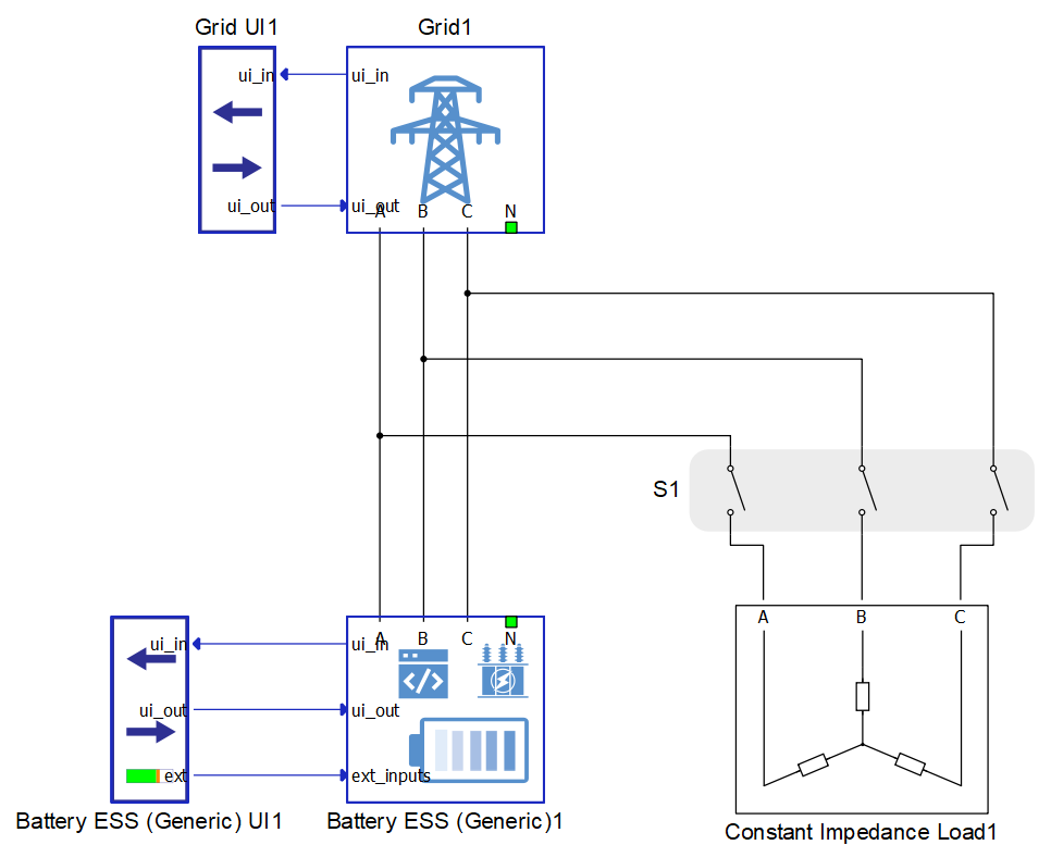 The model consists of a Battery EES (Generic) connected to the Grid with corresponding UI components and a passive load that can be connected or disconnected.
