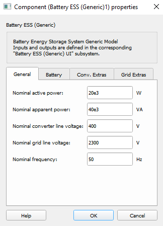 Unlike common microgrid components where you need to define all inputs and outputs, generic components have a user interface where all the inputs and outputs necessary for the operation of the General Battery are already defined. Because this block is unlocked, there is also a possibility for adding additional, user-specific functionalities and improvements such as communication interfaces or optimization logic. In addition to the usual inputs and outputs set by the power management system, there are also external inputs related to system specific factors. In this case, the external input is the initial State Of Charge (SOC).