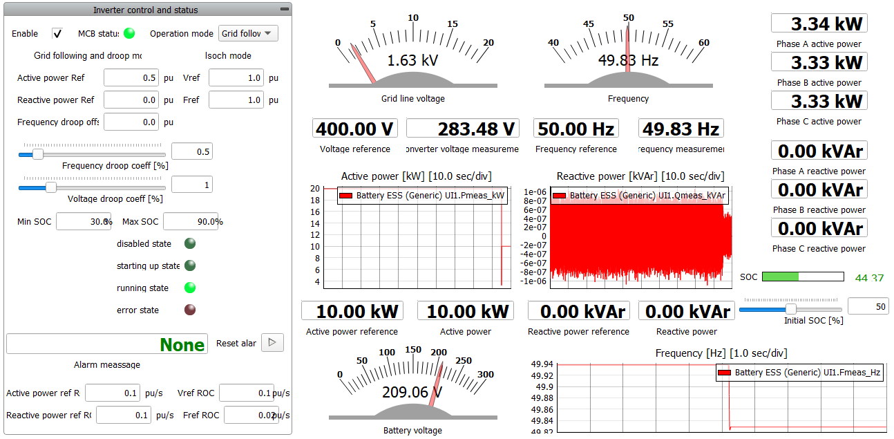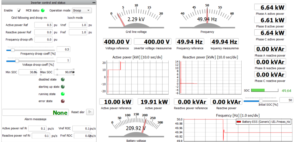 As mentioned above, one of the characteristics of generic components is that they can operate in two grid-forming modes: droop mode and isochronous mode. When droop mode is chosen, it means that you can set references for active and reactive power. Unlike in grid-following mode, the inverter can operate when disconnected from the grid, with its operation is defined by its droop characteristic. Figure 6 shows the case when the inverter operates in droop mode parallel with the grid. After approximately 2 seconds, the grid is disconnected and the battery inverter forms the grid. The frequency is 49.88 Hz instead of 50 Hz because of the defined droop characteristic. The frequency droop characteristic is defined by the coefficient and offset values.