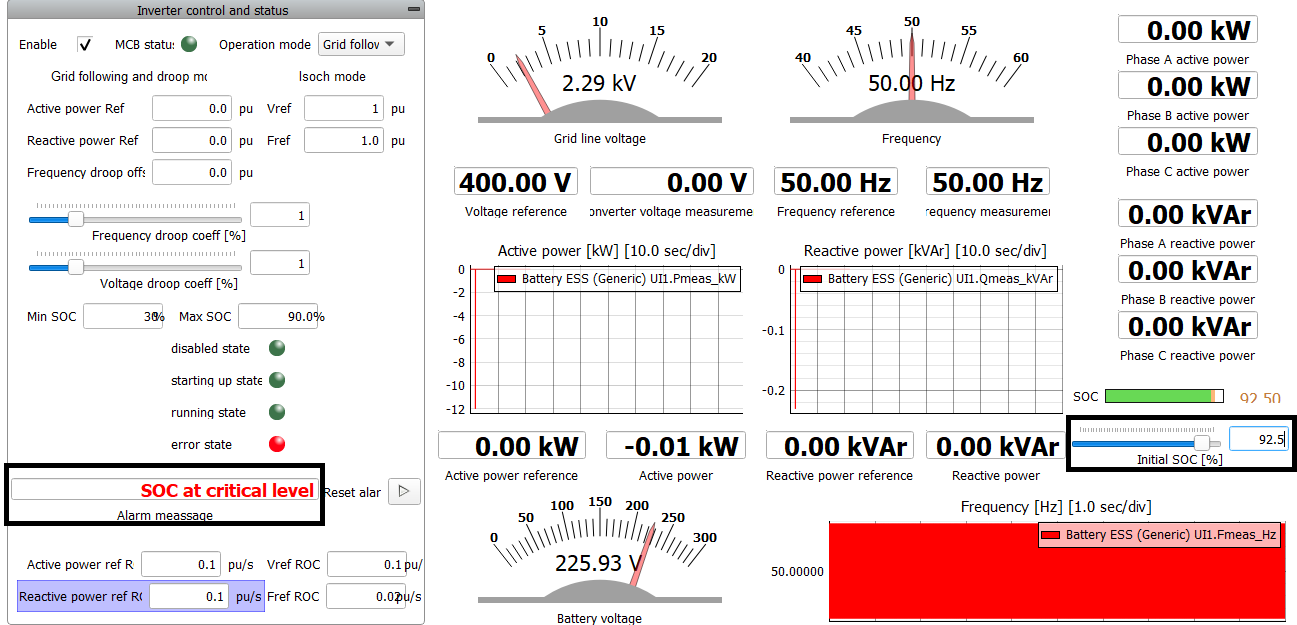 Figure 5 shows the part with the inverter control where you can read the state of the inverter as well as get information if protection is active. Here you can also read the measurements of active and reactive power, voltage and frequency measurements, and SOC. Figure 5 also represents the case when the inverters operates in the grid-following mode, in which you can change active and reactive power.