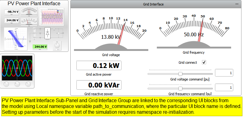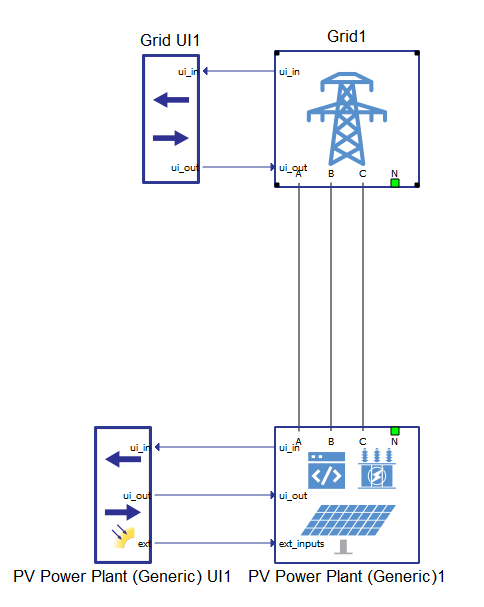The model consists of a PV Power Plant (Generic) connected to the Grid. There are also two user interface blocks which are intended to be used for sending and reading signals associated with Grid and PV Power Plant components respectively.