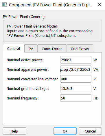 Generic components, unlike switching and average components, have inputs and defined outputs within the user interface. The PV Power Plant (Generic) component consists of two main parts: a high-level control subsystem and a low-level control subsystem with the power stage and all the measurements. You only need to change the parameters on the mask of the component (Figure 2) while all the inner logic and the power stage itself will be automatically scaled according to the parameters.