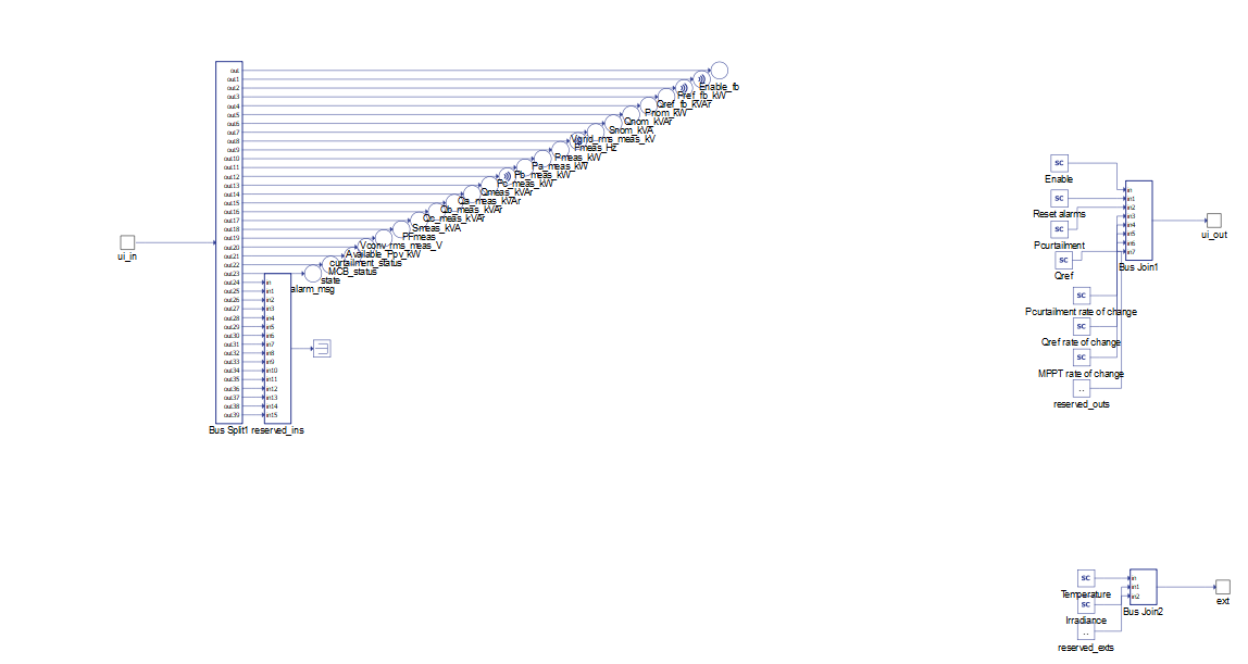 User Interface components make it easier for you to use Generic components. Unlike common microgrid components where you need to define all inputs and outputs, within the user interface all the inputs and outputs necessary for the operation of PV plant components are already defined for you. This is shown fully implemented in Figure 3. All that you have to do is just connect the Generic component with the appropriate User Interface block. Within this block, there are also some reserved inputs and outputs that can be used for additional functionalities and improvements. In addition to the usual inputs and outputs set by the Power Management System (PMS), there are external inputs related to external plant factors. In this case, the external inputs are temperature and solar irradiation.