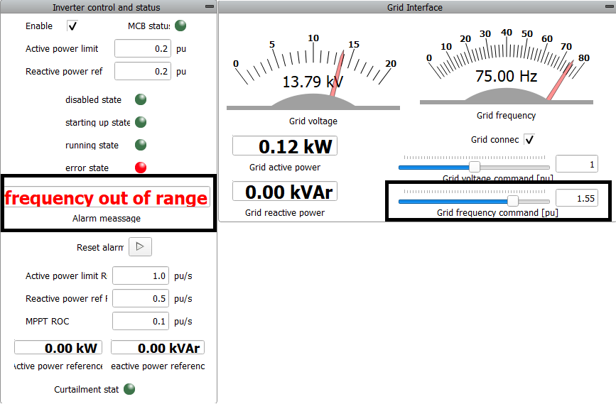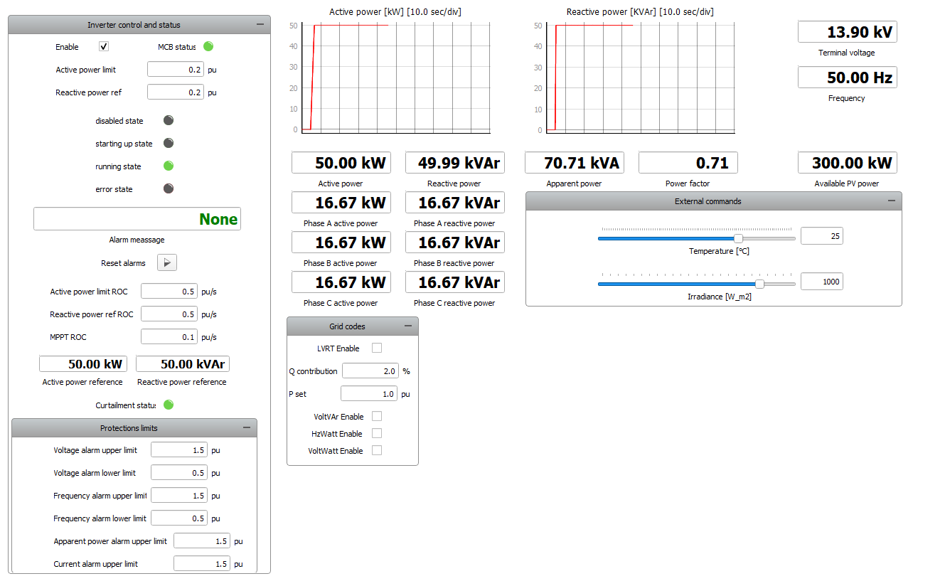 PV Power Plant Interface is shown in Figure 5. The left of the figure shows the Inverter Control and Status where you can read the state of the inverter as well as get information if protection is active. Here you can also read the measurements of active, reactive and apparent power, as well as the power factor. Parameters, such as temperature and irradiance, can be changed in the External commands group.