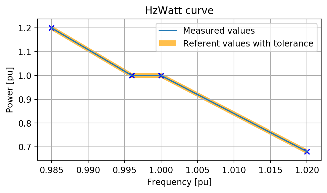 The last test case plots the HzWatt curve with reference and measured values as you can see in Figure 8. There are also indicated points corresponding to the measured frequency and active power. This plot is generated in TyphoonTest IDE.