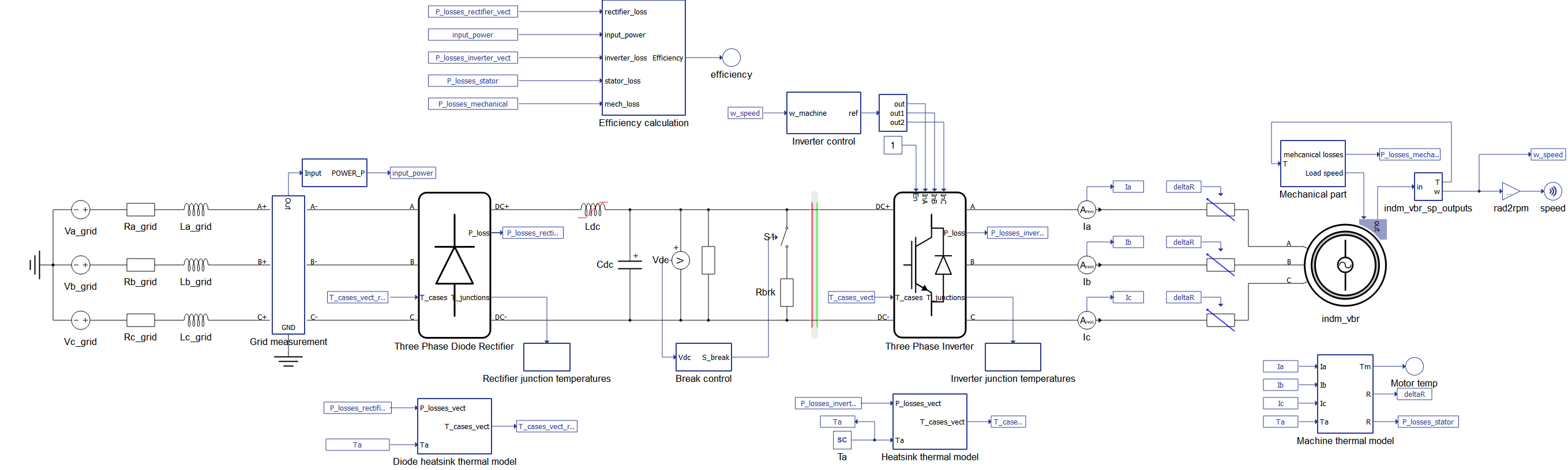 The model also includes an algorithm that calculates efficiency for the whole drive. It takes into account input power, power lost at the rectifier, power lost at the inverter, power lost in the stator of the machine, and mechanical losses. Based on these inputs, algorithm outputs the efficiency of the whole drive system.