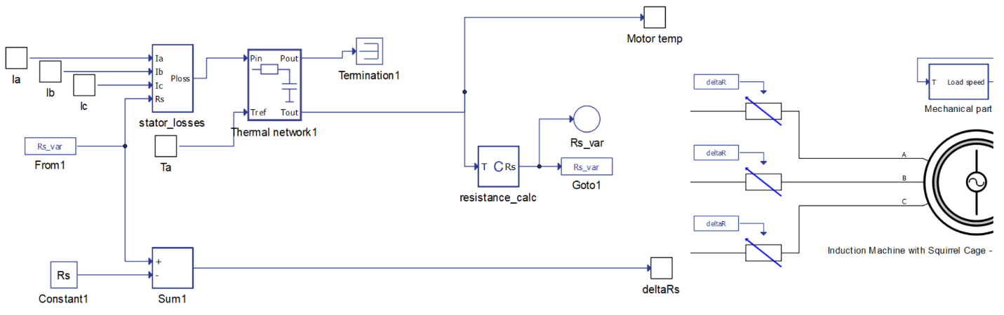The idea behind the machine thermal model is to demonstrate the effects of temperature on the stator resistance and to calculate the stator losses of the machine. The model takes the stator currents along with ambient temperature and outputs motor temperature as well as changes in the stator resistance deltaRs. The electrical-thermal coupling is achieved by using variable resistors, a.k.a Time Varying Elements (TVE), at stator terminals that are directly controlled by deltaRs (Figure 4).