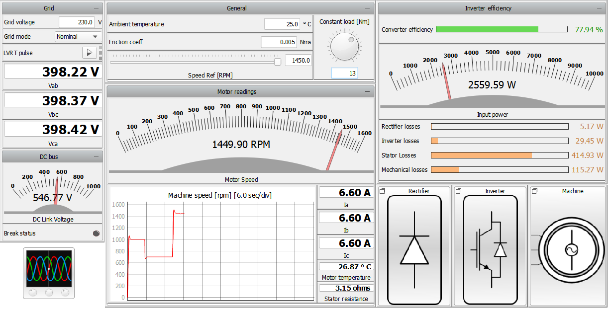 If you want to observe diodes, switches, or junction temperatures or to observe the power losses trend, you can do so by opening the dedicated sub-panel shown in bottom-right part of Figure 6. In addition, in the Machine sub-panel you can observe the trend of mechanical losses, motor temperature, and stator resistance.