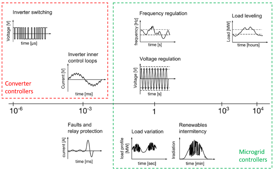 Microgrid controllers are the top-level controllers responsible for steady-state regulation of voltage and frequency as well as load/energy management. Relative to power electronics models, their slower dynamics can be matched by average/generic DER types. Figure 1 can give you some idea of critical time constants of interest for microgrid controllers among other applications and controller types.