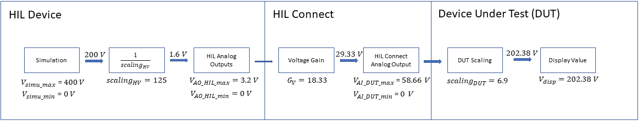As mentioned in the Introduction, the rated voltage range of the HIL device analog outputs is from -10 V to +10 V. Therefore, we still need to scale the simulated voltages appropriately. Scaling can be calculated by considering the ranges of both the simulation variable and the DUT analog input voltage specifications: