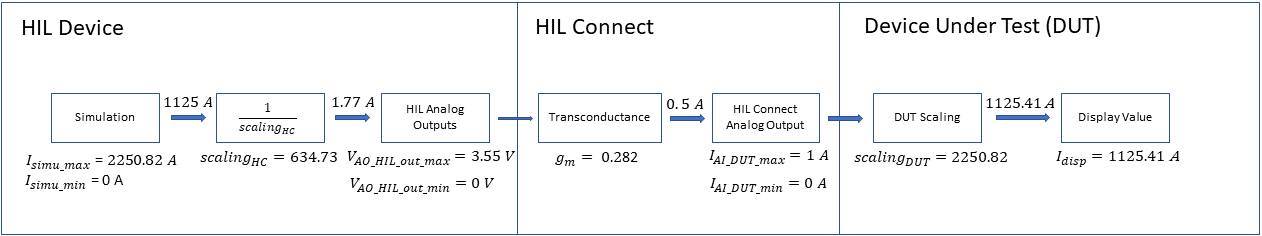 To do so, the currents measured in the simulation are represented as voltage values at the HIL device AOs. Therefore, we need to scale the signals appropriately. Scaling can be calculated by considering the ranges of both the simulation variable and the DUT analog input current specifications:
