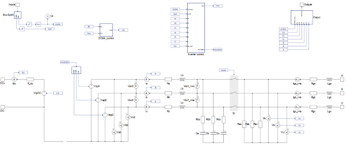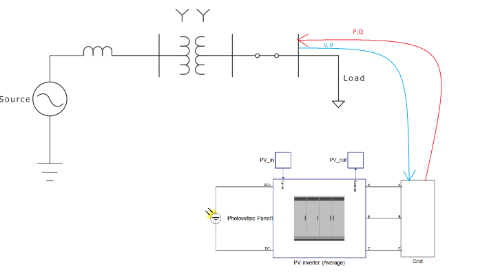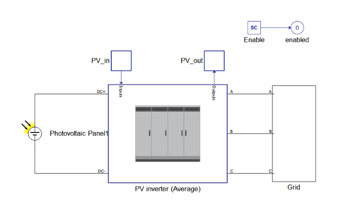 The model of the PV plant consists of a photovoltaic panel, an average model of a PV inverter, and a three-phase voltage source. The PV inverter (average) component is used directly from the Microgrid Library.