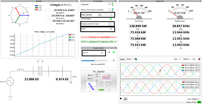 The functionality of this inverter is very straightforward. When the inverter is enabled, it will reach the maximum power point. There is also a possibility to set the reactive power in the Inverter Control options. For voltage-power exchange between the two models it is necessary to first enable communication and then turn the inverter on. There is also a contactor in OpenDSS controlled through HIL SCADA which should be closed. For the power flow report, it is necessary to click the Generate power flow report button.
