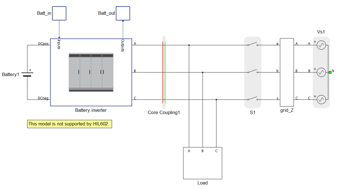 In this example, when the more detailed switching models for battery inverters are used, two processing cores are required in order to avoid memory overload. Thus, the model needs to be divided into the two cores using a core coupling component, as shown in Figure 3.
