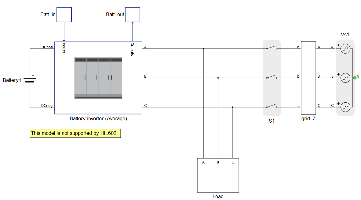 The model under test consists of a Battery inverter connected to the Grid (represented by a Three-phase voltage source component and a RL section) with a passive load (represented by RL components). This application note compares performance between the switching (Figure 1) and average (Figure 2) models of the Battery inverter component.