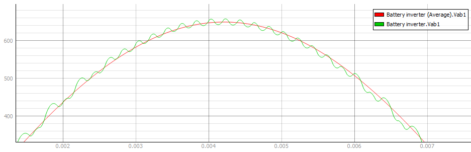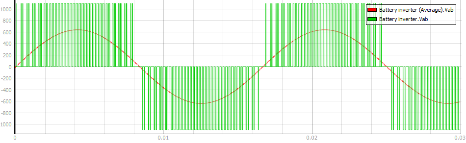 The voltage waveform Vab is measured at the output of the converter before and after the filter that connects the converter to the grid. In the Switching Inverter model, the switching components are used to create an output voltage, and so the measured output voltage has a switching waveform (Figure 6, green). In the average model, the measured output voltage has a continuous waveform generated from ideal voltage sources, shown in (Figure 6, red).