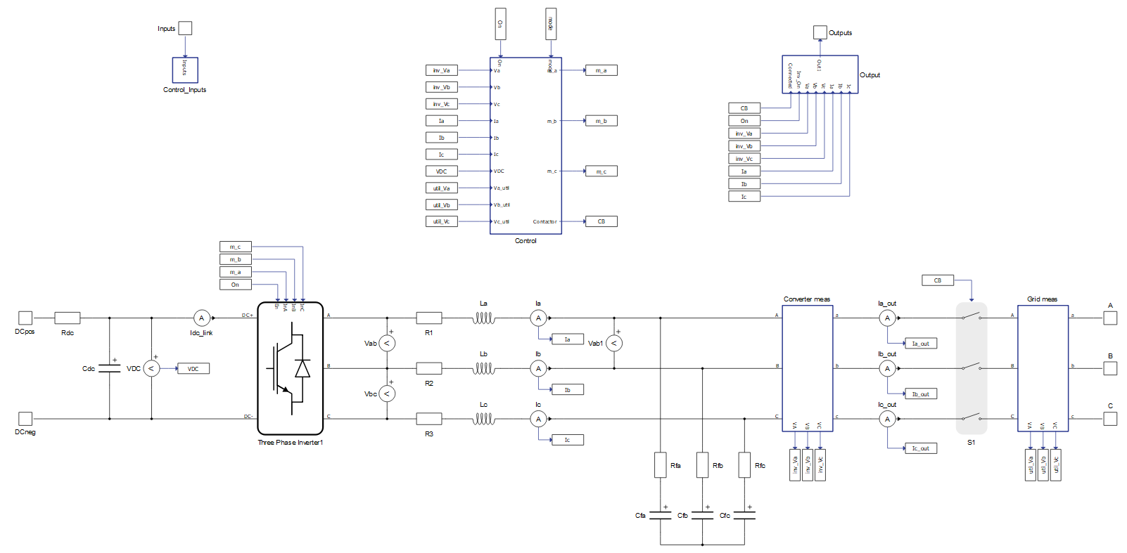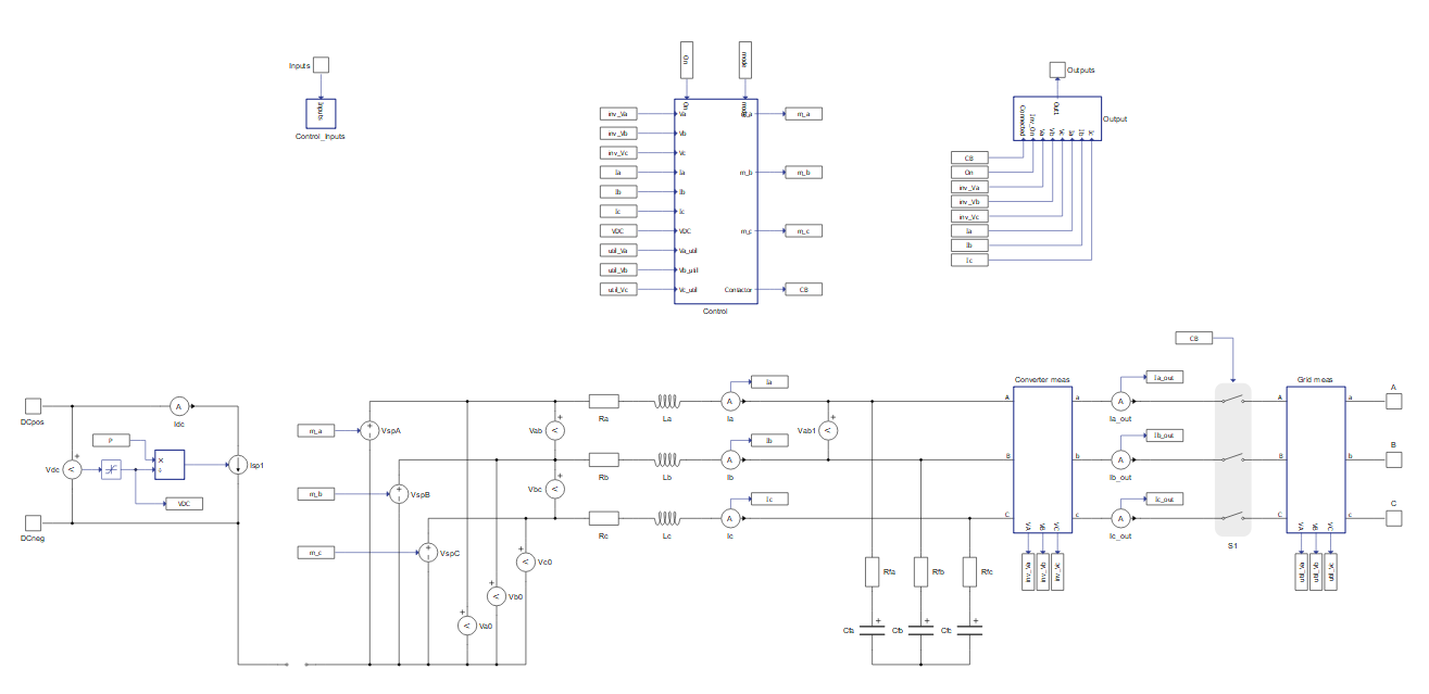 Both the average and switching models implement a three-phase device. From the perspective of controller functionality, these two models are identical. From the perspective of the power stage, they are almost the same except for one key difference: the switching model uses the detailed power electronics three-phase voltage source inverter component, while the average model uses three signal controlled voltage sources to emulate the behavior of the inverter.