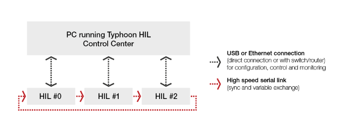 All devices in a multi-HIL configuration should be connected to a single computer using either direct USB or Ethernet connection. The multi-HIL configuration is controlled by a single instance of the Typhoon HIL Control Panel application or its API. The multi-HIL user experience is similar to single device operation. This means: