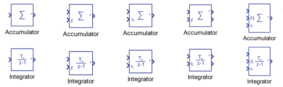 - The Output terminal type is calculated based on the types of In and Initial condition ports. If any of the two types are real, the output type will be real, also, if any of the two types are int, the output will be int, else the output will be uint.