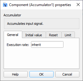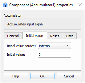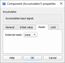 Accumulator and Integrator components differ only in the calculation of the output signal value. Everything else described in this section is the same for these two components.