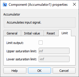 The Output limitation is used to limit the value of the Accumulator/Integrator output. Both upper and lower saturation limits can be defined if the Limit output property is enabled. Values inf and -inf define that there is no upper and/or lower limit.