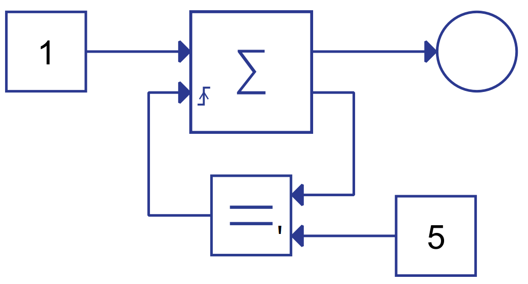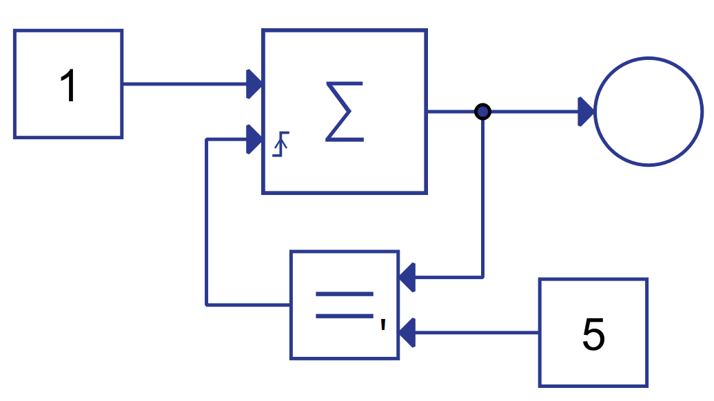 Let us consider the example in Figure 5. The Accumulator component will count to 5 and then reset to 0. If the asynchronous reset is used, the output of the Accumulator depends on the value of the reset signal, and on the other hand, the reset signal depends on the value of the Accumulator's output. This forms an algebraic loop that cannot be solved. To break this loop, the state output must be used as illustrated in Figure 6. Because the asynchronous reset is used, the state of the Accumulator will be reset immediately when the state value reaches 5, and the Accumulator output will be: 0, 1, 2, 3, 4, 0, 1, 2, 3, 4, 0, 1...