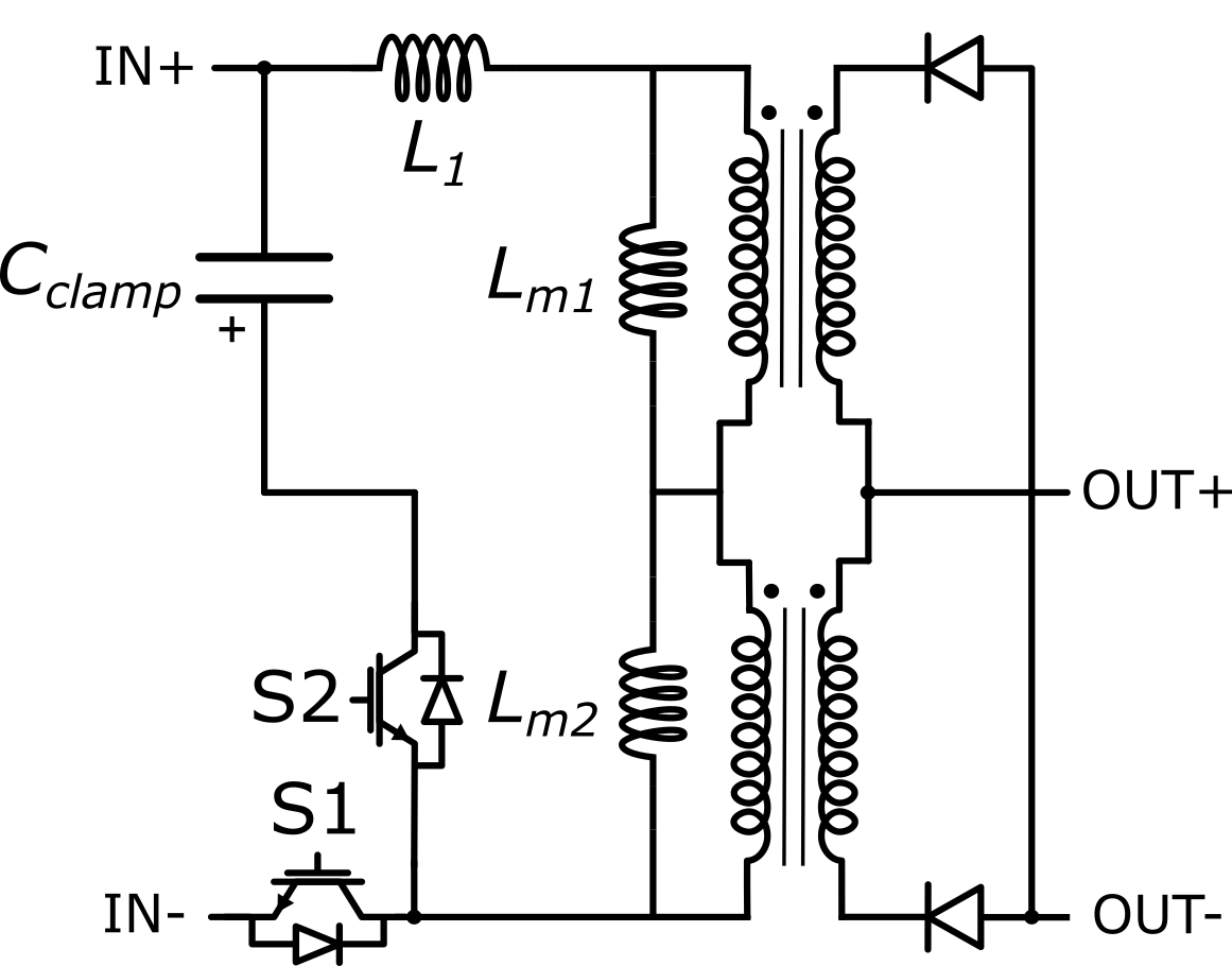 The schematic block diagram of the Active Clamp Forward-Flyback converter component differs depending on selected Solver platform. When UltraCore is used, a clamping capacitor is placed inside the converter block. This is done due to the existence of fast dynamics between transformer inductances and the clamping capacitor, which is important to consider for real-time simulations. By simulating these fast dynamics using UltraCore, model fidelity is improved. In TyphoonSim, Solver platform affects only the internal structure of the component. Schematic block diagrams with corresponding switch naming when either the UltraCore or SPC platform is used are given in Figure 3 and Figure 4, respectively.