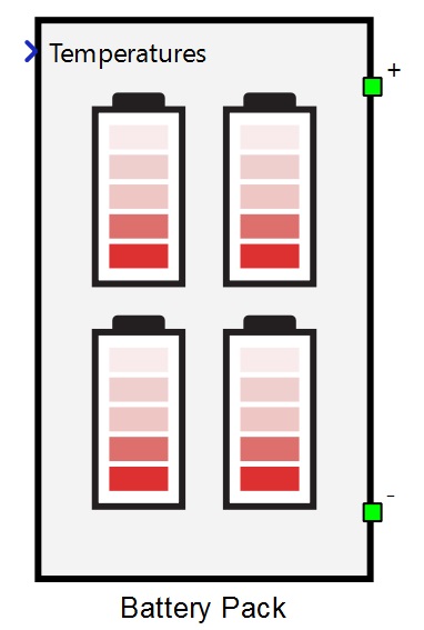 The component has two power electronics terminals, with a positive terminal on top and a negative terminal on bottom of the component (as shown in Figure 1). Additionally, there is another signal processing input which is a vector input of the cell temperatures, where each input corresponds to the respective Battery Cell component.