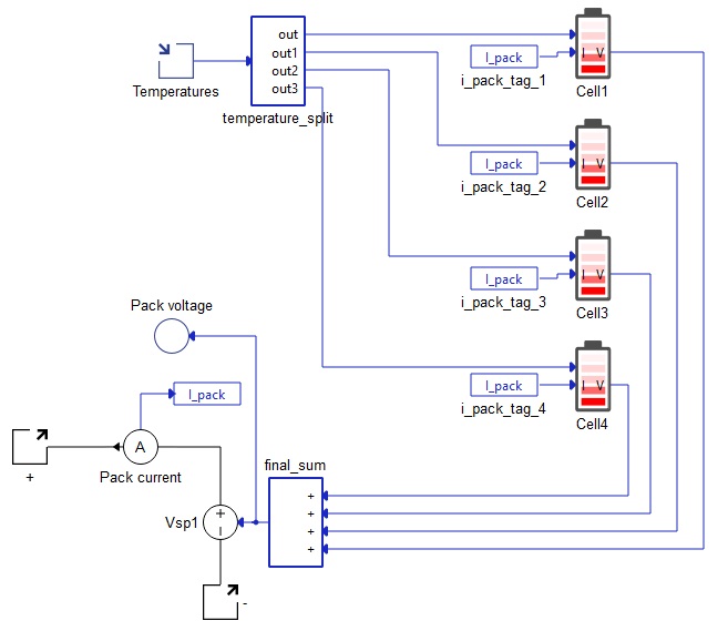 The Battery Pack model is implemented in Typhoon HIL Schematic Editor using a variable number of Battery Cell components, a controlled voltage source, a current measurement, and a temperature input per 4 Battery Cell components. The Pack voltage signal that controls the voltage source is a signal processing sum of terminal voltages of all Battery Cells. Similarly, the Pack current measurements is the current through all Battery Cell components.