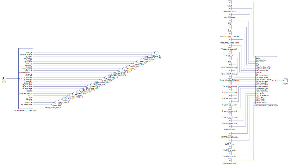 - Voltage droop functionality - Calculates voltage references signal when droop control mode is activated. This control unit is described in Voltage droop unit in DER generic components.