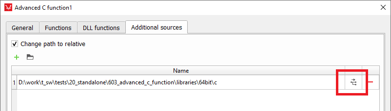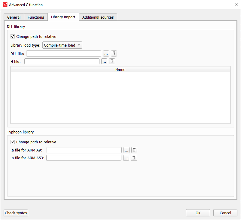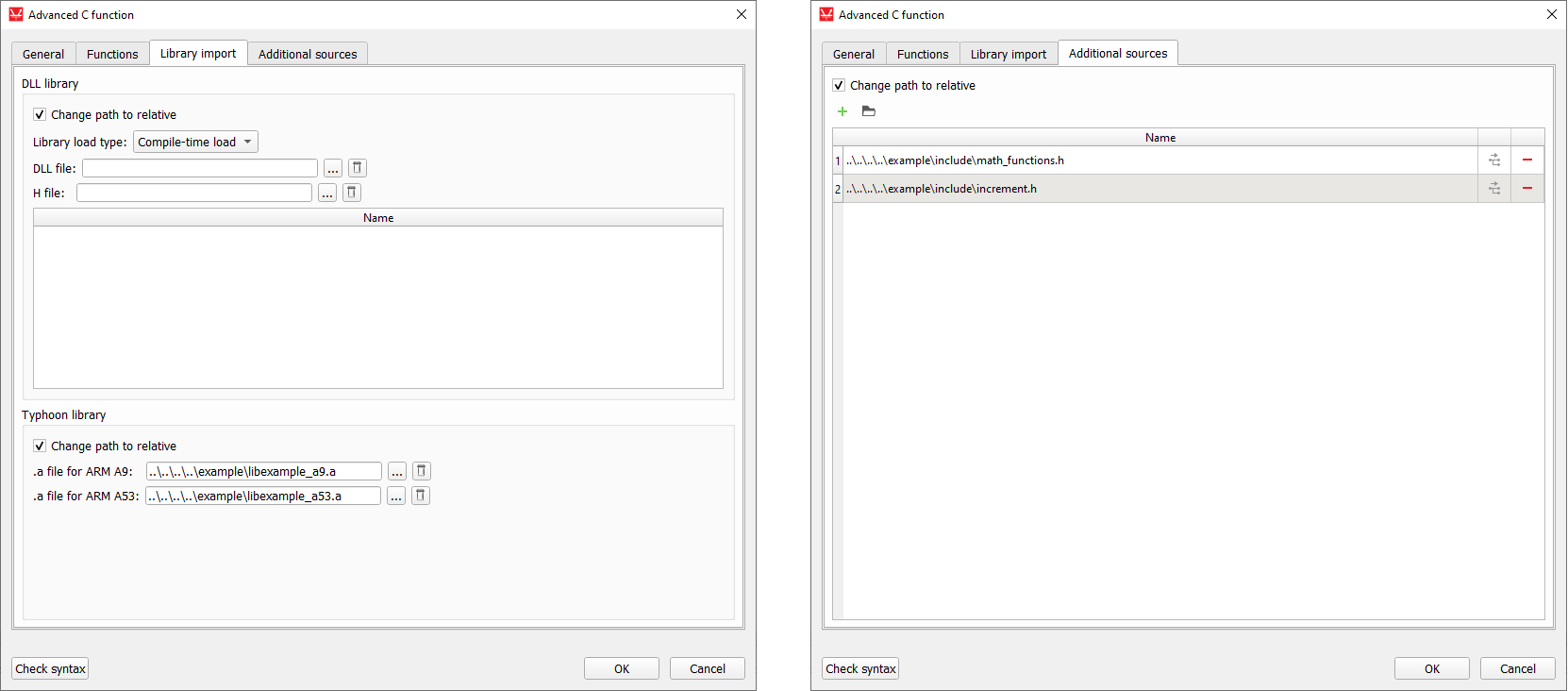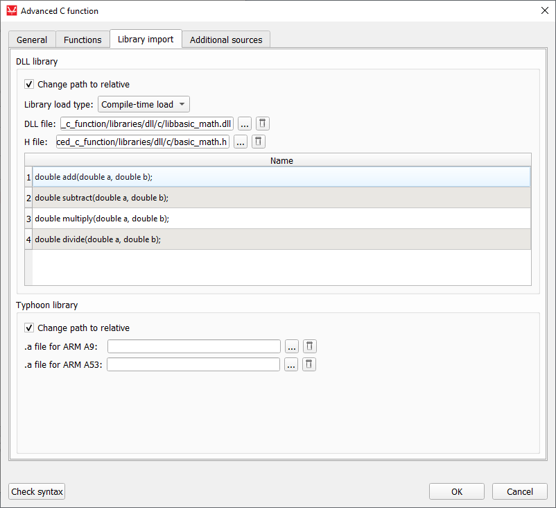 In addition, C function allows you to add additional library files (.dll, .so, and .a) via the Library import tab and external C/C++ language source files via the Additional sources tab.