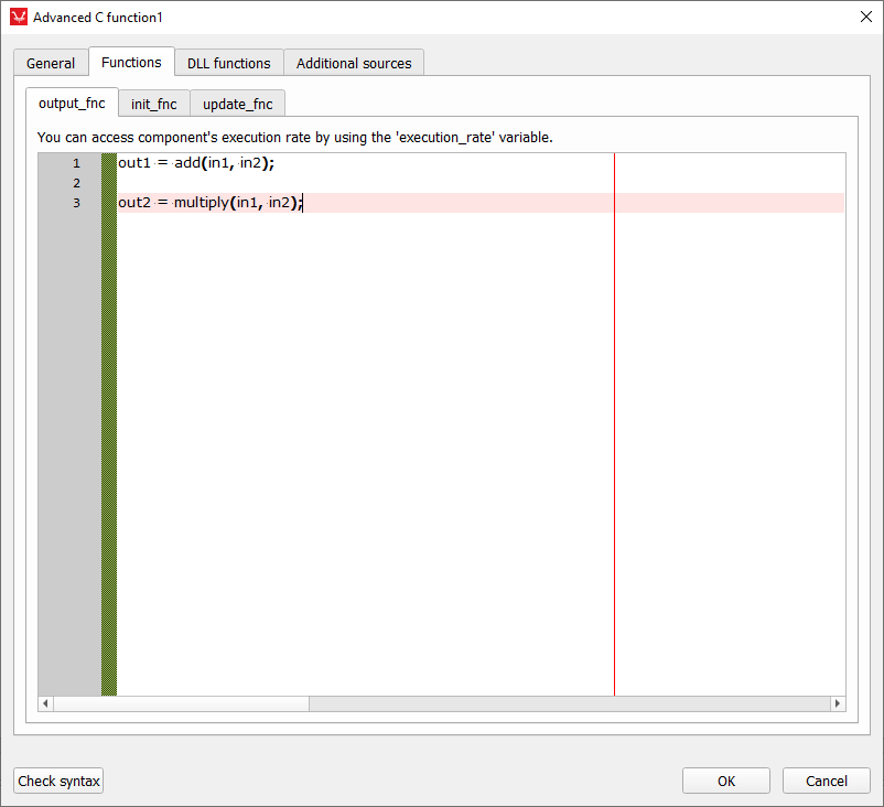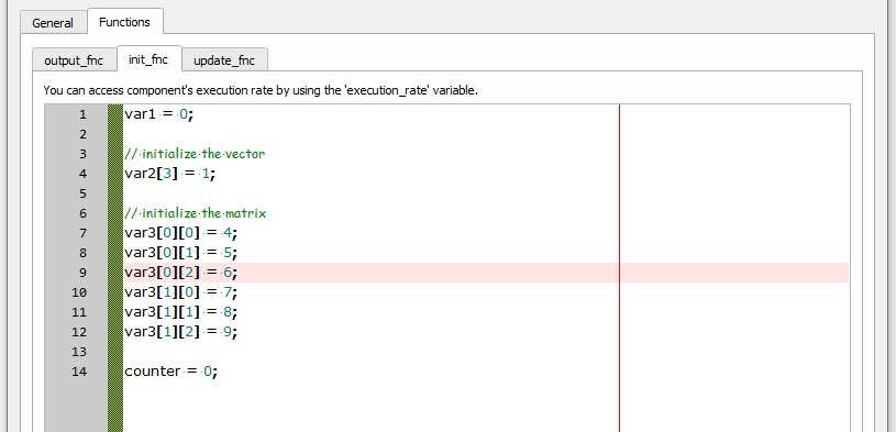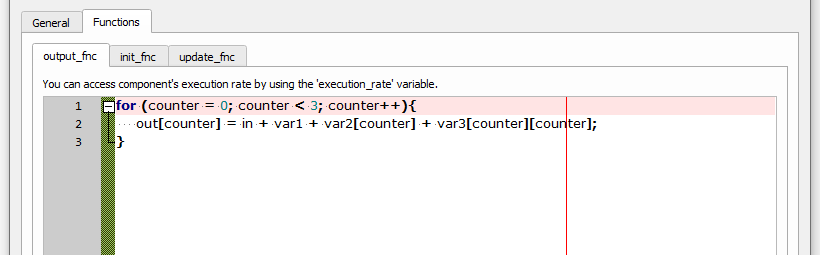 The Functions tab allows you to define arbitrary init, output and update functions.