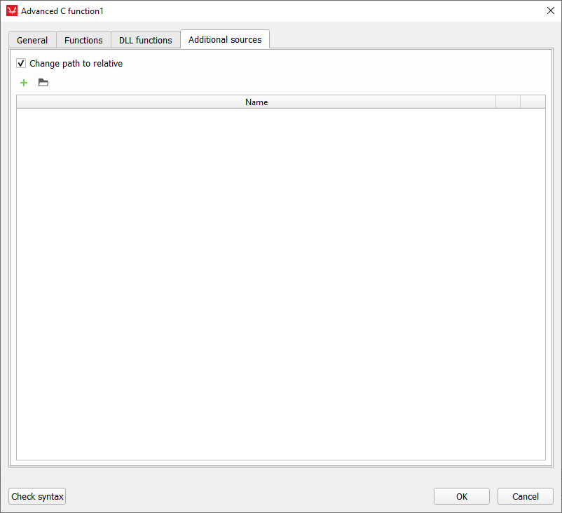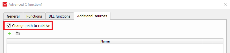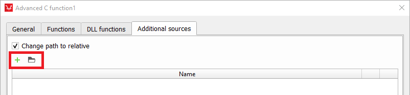 This tab, in addition to a C function, allows C and C++ language source files (*.c, *.cpp and *.h) to be imported. Figure 19 shows the user interface of the Additional sources tab.