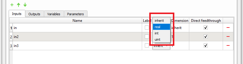 You can use the Type column to define a parameter’s signal type. The signal type can be set to: real, int and uint.