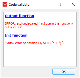 If the code is syntactically correct, you will get the No errors found message, otherwise the Code validator dialog will be shown (Figure 11). Every error message inside the Code validator dialog has a header and content. If you click on the header, you will be automatically redirected to the function that caused an error.